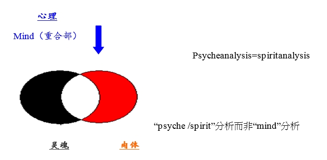 圣经辅导与心理咨询的关系,实际上是灵魂与心理的关系,那么,灵魂与心理有何联系呢?在英语中,soul 和 spirit意义有明显差别,汉语一般将soul译作魂而将spirit译作灵,若套用荣格的说法,soul是个体无意识,spirit则是集体无意识。在《圣经》中,the Spirit是上帝的同义语, 专指三位一体上帝的第三格“圣灵”。英语中psyche含有soul\spirit\mind即灵魂、精神和心理多重含义。如果将人看作灵魂与肉体的统一体,则心理是灵魂与肉体的重合部分,并不独立于人的灵魂,只是灵魂的一个小窗口。潜意识是灵魂中黑暗的人不能觉察的部分:灵魂=潜意识+心理。灵魂、心理与肉体关系可用下图表示(详见《中国性科学》2005年11期,《母亲阳具的精神分析》一文,作者董建林)
