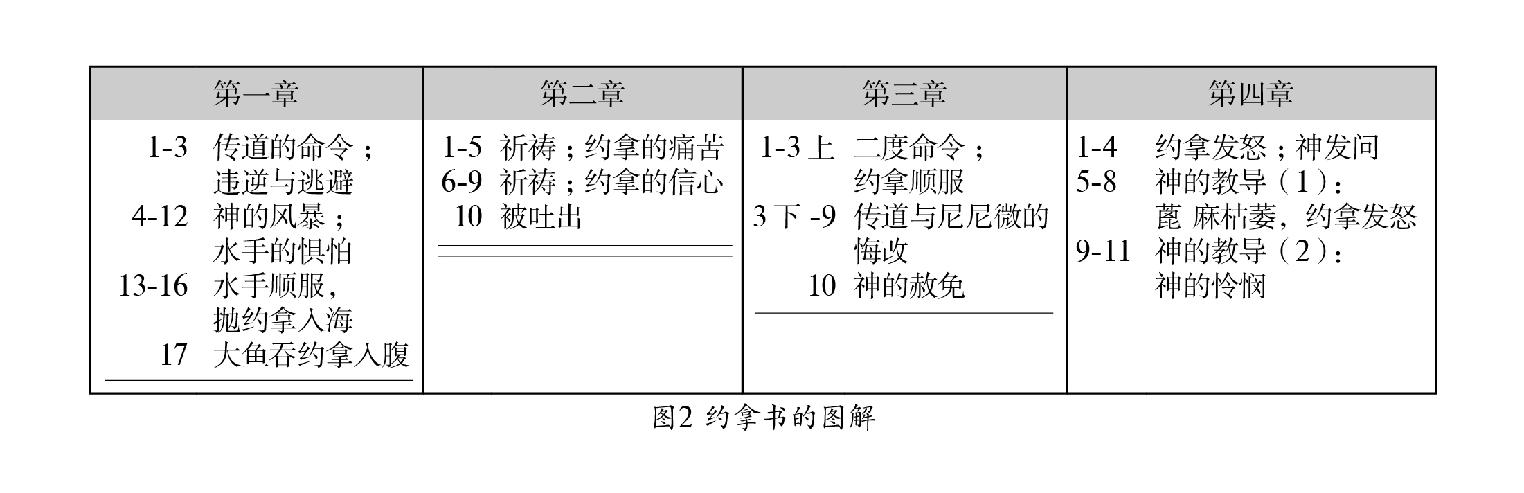 如约拿书的图解所示,按照顺序,以简短的话囊括每一段,只要顺着摘要看,就可以感受到全卷的思路。而综览整个图解,全书的轮廓便一清二楚。例如,我们很容易看出,第3章成就了第1章原初的目的,就是到尼尼微的使命,以及百姓的悔改。因此,全卷有两处平行,第1与第3章,第2与第4章。再者,重点为后一个平行,因此约拿书的要义不在于宣教,而在于约拿(和以色列)对神的态度,和对神要怜悯之人的态度。第4章是“故事的精髓”,教导神的怜悯。