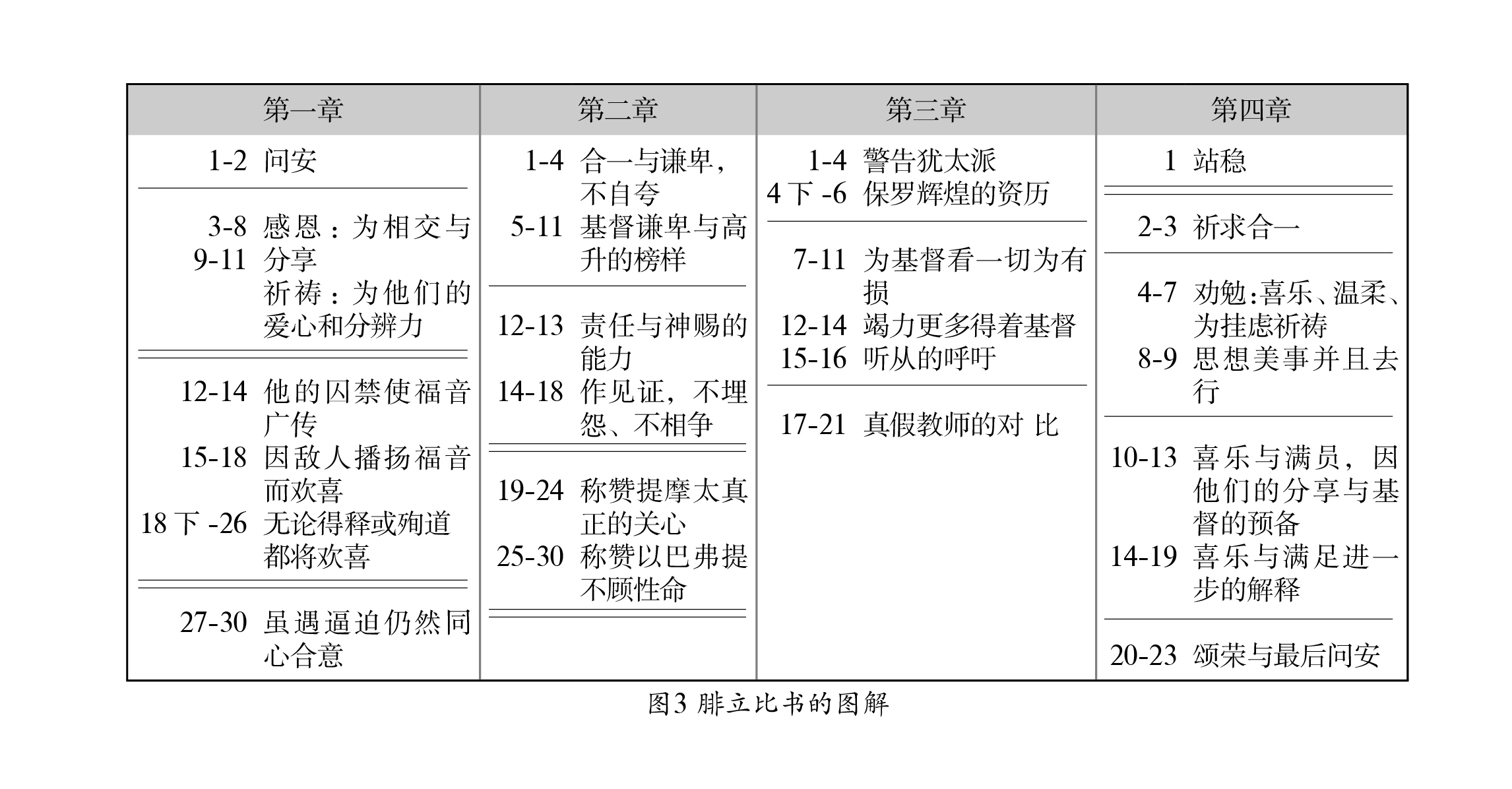第二步:在图解全卷之后,就可以回头检查,寻找全书各段中思路进展的模式。我们需要寻找段落之间思路中断之处,并且用单线作记号表示出来(参图3)。内容类似的段落组成全书的大段,这样便能看得更准确。有些思路的改变很容易看出,如从保罗对自己的评语(1:12-26)转为论腓立比的情形(1:27-28),或进一步从腓立比人的情形转而称赞提摩太和以巴弗提(2:19-30)。有些改变则不太容易察觉,如从谦卑的提醒(2:1-11)稍微转向警告(2:12-18),或将4:1节与3:17-21节相连,而不与4:2-9节相连。至于最后一点,读者暂时只能猜测原因,等到仔细解析全书之后,才能完全澄清。