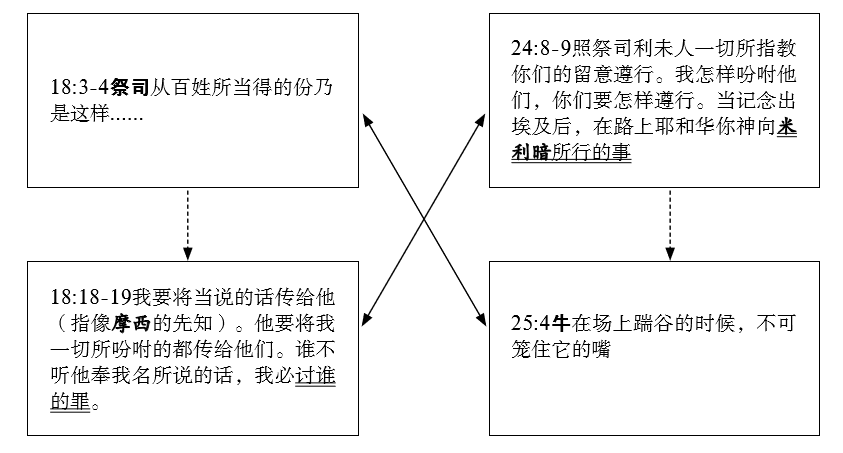 祭司利未人和百姓的相互关系也体现在18章。这一章关乎以色列的宗教领袖祭司利未人,特别是“耶和华所兴起的先知”。克里斯滕森(Christensen)将它分为两个部分:关于祭司利未人的律法(1-8节)和关于先知的律法(9-22节)。这两个部分可以用“吃”和“听”两个字来总结:第一部分的核心是3-4节,论祭司从百姓所当得的份,处理的是人和人的关系;第二部分的核心是15-18节,论神兴起摩西/先知的功用是让百姓可以听见神的话,又可以免于死亡,处理的是人和神的关系。18章这两个部分的关系就和24:8-25:4的A-A’形成交叉平行: