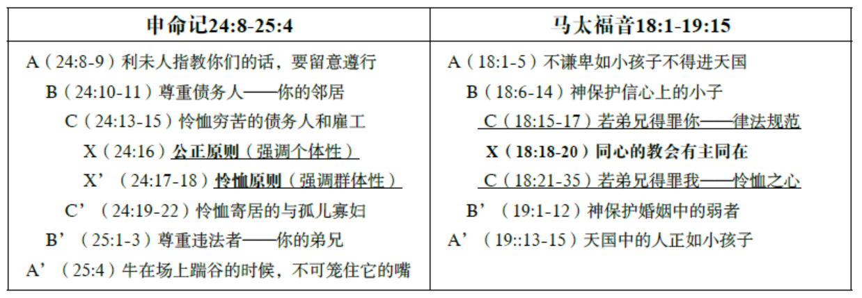 主耶稣在马太福音中只有两次直接谈及教会,这是第二处,其中所呈现的教会伦理原则与申命记相关段落不谋而合,我们可以用结构分析对比如下: