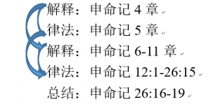 在解释与律法彼此交织的关系中,从体裁上说,申命记4章的解释在申命记6-11章得到了扩展,申命记5章的律法总则在申命记12-26章得到了扩展。这一解释关系按其文学的特征,其结构如下: