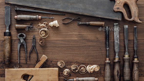 Frame composed of a collection of vintage woodworking tools on a workbench: carpentry, craftsmanship and handwork concept, flat lay