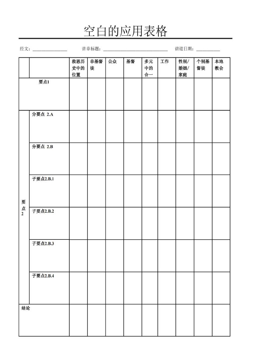 按照《圣经神学与教会生活》这本书所提供的一个应用表格[1],我会思考一段经文在不同层面上的应用。首先是社会:在我们这个世界上有哪些谎言,哪些世上的观点正和这段经文产生碰撞和张力。其次,在基督教世界里有哪些和这段经文产生冲突的错误的神学,或者说不健康的基督徒思维方式。第三,在这个教会里有不同的人:自由职业者、办公室职员、全职妈妈、退休老人、小朋友……这段经文对他们会说怎样的话?当然,我不能够保证一篇讲章能够对所有的人群说话,但是如果我根据这个表格去捋一遍的话,会发现这段经文至少可以对其中两三种人说话,而这两三种人往往可以覆盖到大部分人。