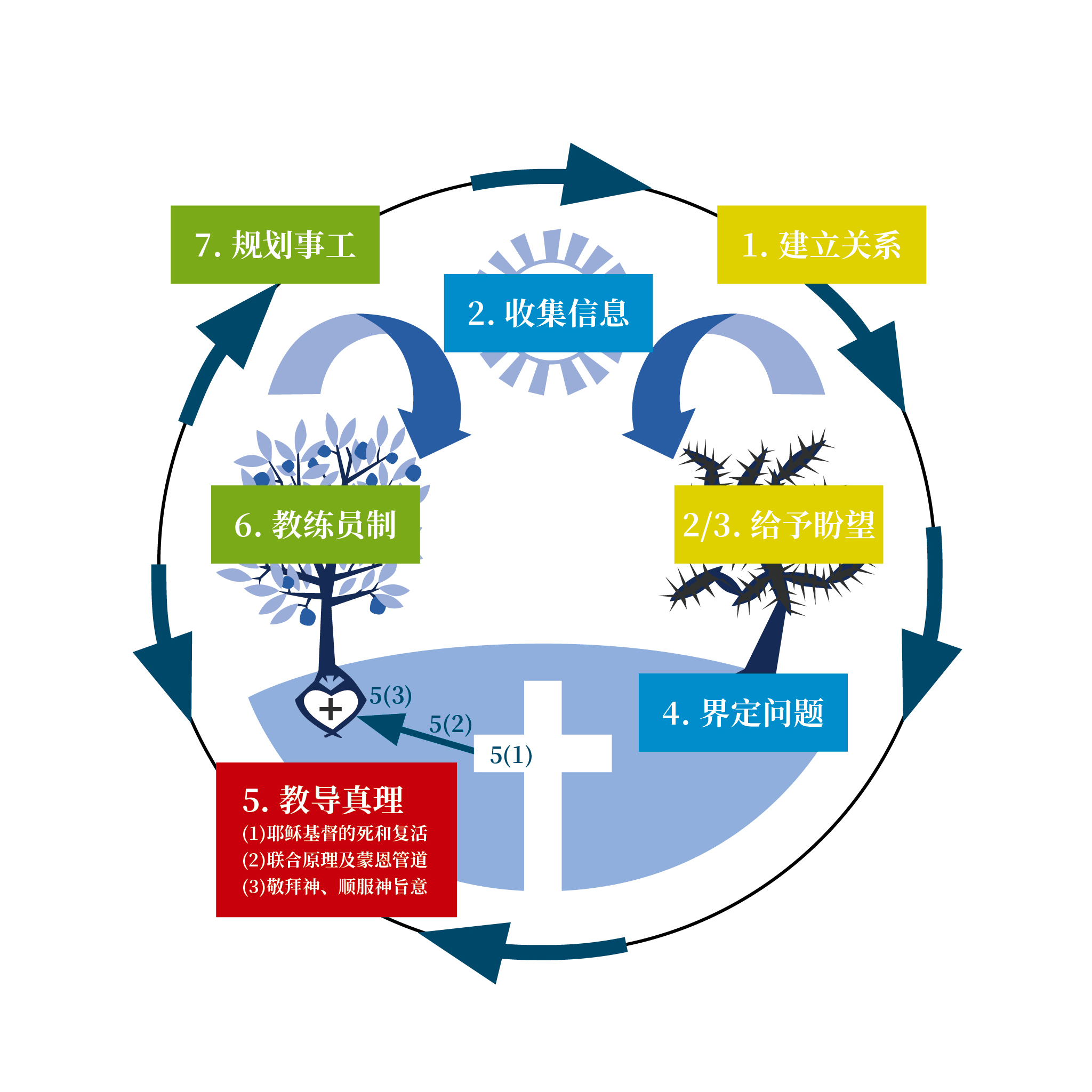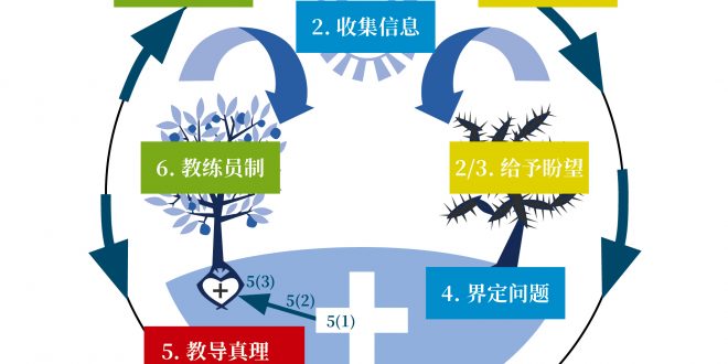基于这本书的原则和伟恩·麦克(Wayne A. Mack)博士在书籍[7]及OIC[8]课程中所授之方法,笔者所采用的方法论分为七个步骤,它仍旧符合“爱、知、说、行”的基本框架。在“爱、知”的环节,平行复制为“爱(建立关系)、知(收集信息)、爱(给予盼望)、知(界定问题)”四个步骤。“说”维持一个原则、步骤不变。笔者个人会区分“主的十架”、“与主联合”、“我的十架”。在实践时,结合牧养体系、团契、个人阅读、辅导关系,多维、多方、多次地教导圣经真理。“行”的步骤,我扩展为两点,目的是区分“被辅导者的行为”与“辅导员的行为”。这样,七个步骤分别是:1、建立关系(爱);2、收集信息(知);3、给予盼望和鼓励(爱);4、界定内心的问题(知);5、教导真理(说);6、建立“运动员—教练员”制(行);7、辅导员规划自己的事工(行)。对这些步骤略作展开解释如下: