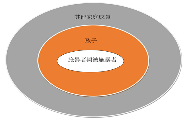 在下图中,我们看到,最中间的部分是施害者与受害者的相互关系,外面的两个圈分别代表受到影响的两个群体;孩子会很直接地受到这些关系的影响,还有其他家庭成员也会因为施暴的关系、滥权伤害的关系而受到一些影响。