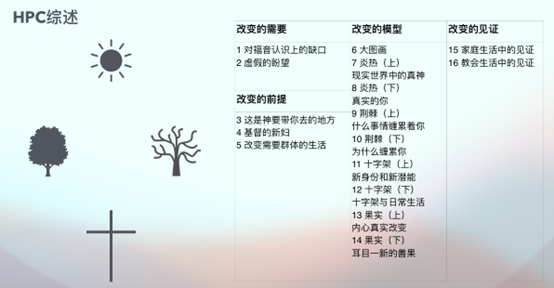 这个模型可以归类为信徒在面对具体问题时,内省心中的偶像,在基督里成长的“成圣模型”。在本书第6章,作者对这一成圣的“大图景”作了整体介绍。第7–8章展开谈“炎热”,即我们所处的环境,特别是一些艰难、痛苦的环境,也包括一些看似祝福但可能带来试探的环境。第9–10章谈“荆棘”,即我们在“炎热”中属肉体的反应,比如抱怨、苦毒,对别人过分的怒气、苛责。第11–12章谈“十字架”,即我们在救恩中的新身份、新动力和新生活。第13–14章谈“果实”,即我们由内心到行为结出的善果。