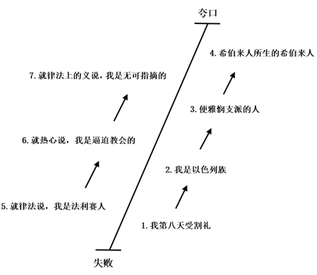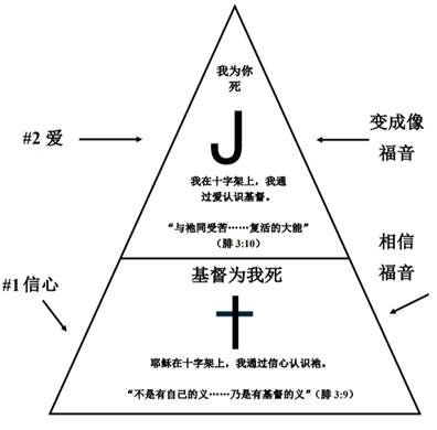 第一部分,介绍J曲线,呈现出“不是……而是……”的结构。具体而言,基督徒的生活不是“失败—夸口表:从失败底部走向可夸口高处的自我称义阶梯”(见下图保罗的例证),而是“J曲线:在基督里经历同死、同复活”。如同提摩太·凯勒在《浪子的上帝——寻找你在天国筵席中的位置》[8]、《福音神学》[9]等文章中所阐释的,福音不是从小儿子成为大儿子,不是从反律主义、相对主义,转变为律法主义、道德主义;而是第三条路,神在耶稣基督里的救赎、接纳。第一部分也让我们通过对腓立比书3:8-11的解经,看到认识耶稣的两种互补的方式:根基是“基督为我死”,我们通过因信称义来认识耶稣;而上层的“我为你死”,是通过与祂同死同复活的方式来认识耶稣。