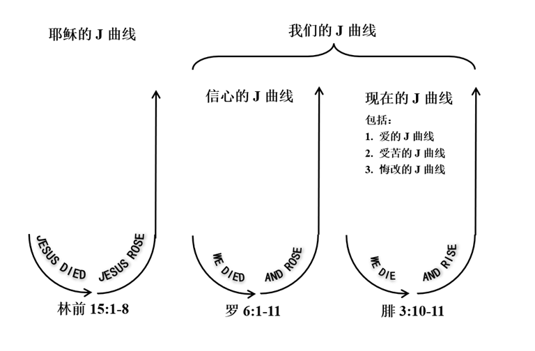 J曲线向我们强调,基督徒的生命形状和基督的生命形状相似,都是一个向下经历死,然后向上经历圣灵带来的决定性复活的过程。它强调的叙事是,我们的小故事与基督的救赎大故事紧密相连,我们在那个大故事里面会变得更像基督,而这个更像基督的过程发生在具体的生活中。