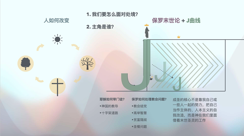 这些问题,引起了三位对于圣经辅导很有热情的弟兄的深入思考:一个更合理的成圣模型的图示是什么?他们专门成立一个课题组来研讨这个问题。作为年轻的、城市家庭教会的传道人,他们对此的关注,不是因为对理论辩难的偏好,而是纠结于自我成长、牧养实践的难题:“软弱的我们,和主托付给我们的软弱小羊们,应该如何成长?”带着这一成长焦虑,他们寻找能够提供成圣动力、成圣路径的属灵资源,进行阅读、思考、讨论。其中,保罗·米勒的《J曲线:日日与耶稣同死同复活》和魏司坚、伽芬关于末世论的书籍文章,帮助他们在这些问题上有了更清晰的看见。于是,他们做了一些整合性的研究,并在一次大会上将他们的研究结果呈现了出来。