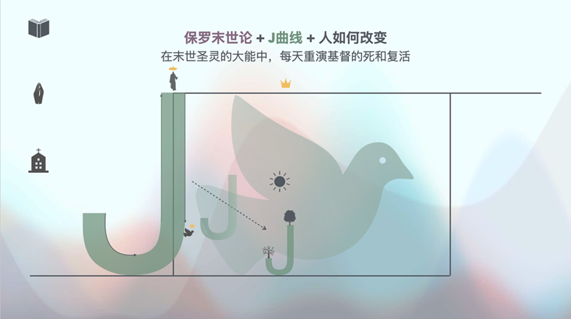 J曲线特别宝贵的一点是,它将那个人们难以理解的末世论神学、受苦神学,在与基督的联合中联系起来。所以,当我们头脑里有一个“J”的时候,我们就很容易想到与基督同死同复活。它提供视角,提供那个更宏大的叙事;它解释我们的生命,也给我们新的盼望和积极地去爱的途径。